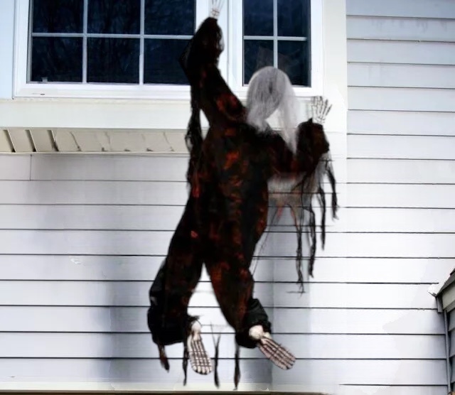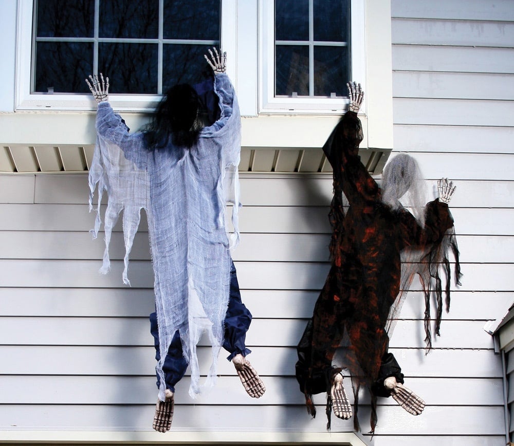 Don't look now, but there is a zombie outside your window! This funny Halloween decoration looks like the backside of a zombie, giving the brilliant illusion that the zombie is climbing! He is wearing a black tattered jump suit with tattered gauze, and has gray hair with skeleton hands and feet.