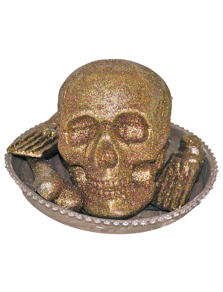 With this beautiful oval dish with glitter gold skull and bones you can quickly decorate your house in a Halloween atmosphere. This dish also provides light. Very beautiful with the glitter skull and bones.
