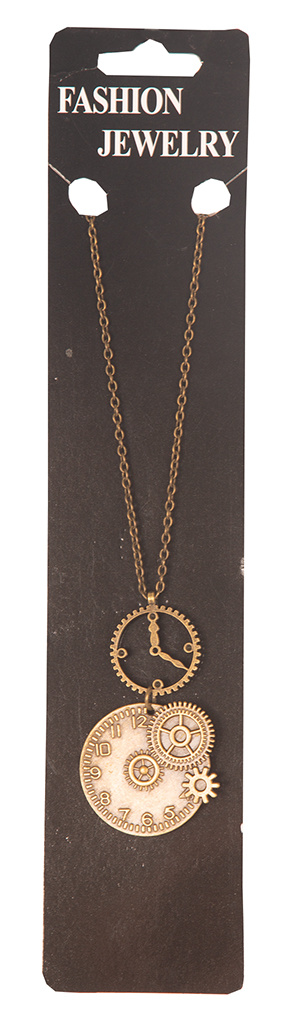 Steampunk necklace with a clockwork pendant. This necklace is packed in a bag, making it nice to give as a gift. - Fine necklace with clockwork symbol for the steampunk theme - Length: 45 cm - Color: Bronze - Packed in a blisterbag