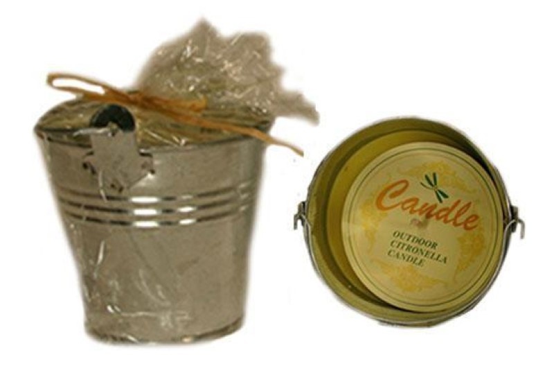 Seau décoratif en zinc avec bougie citronnelle. Le seau mesure environ 8 cm de haut et a un diamètre de 10 cm. Heures de combustion: 8 heures. Bougies anti-moustiques au parfum de citronnelle.
