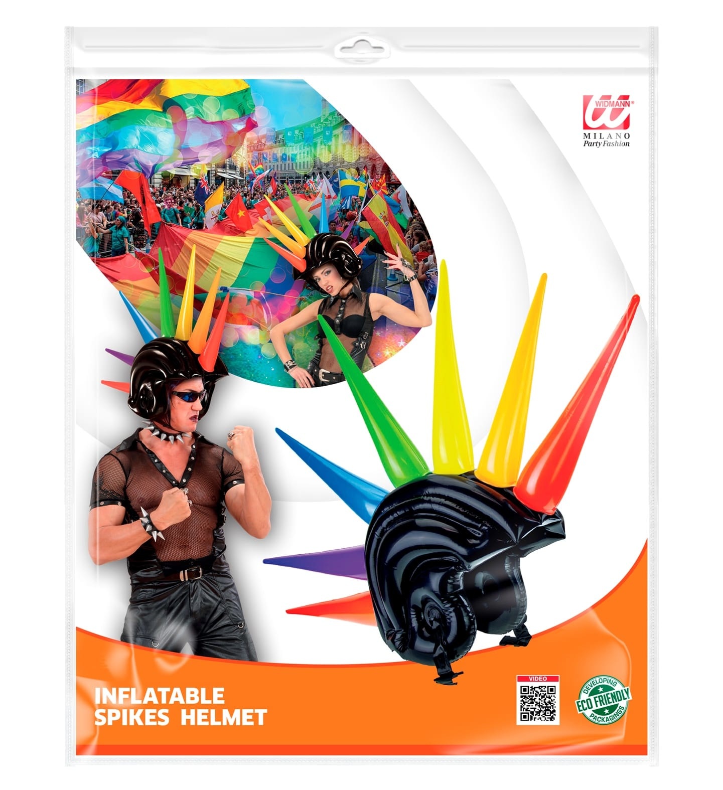Vous avez toujours voulu vous démarquer ? Alors c'est le moment d'acheter ce casque gonflable avec des pointes arc-en-ciel. Ce casque gonflable mesure 90 cm de haut et est fabriqué par la célèbre marque italienne Widmann.