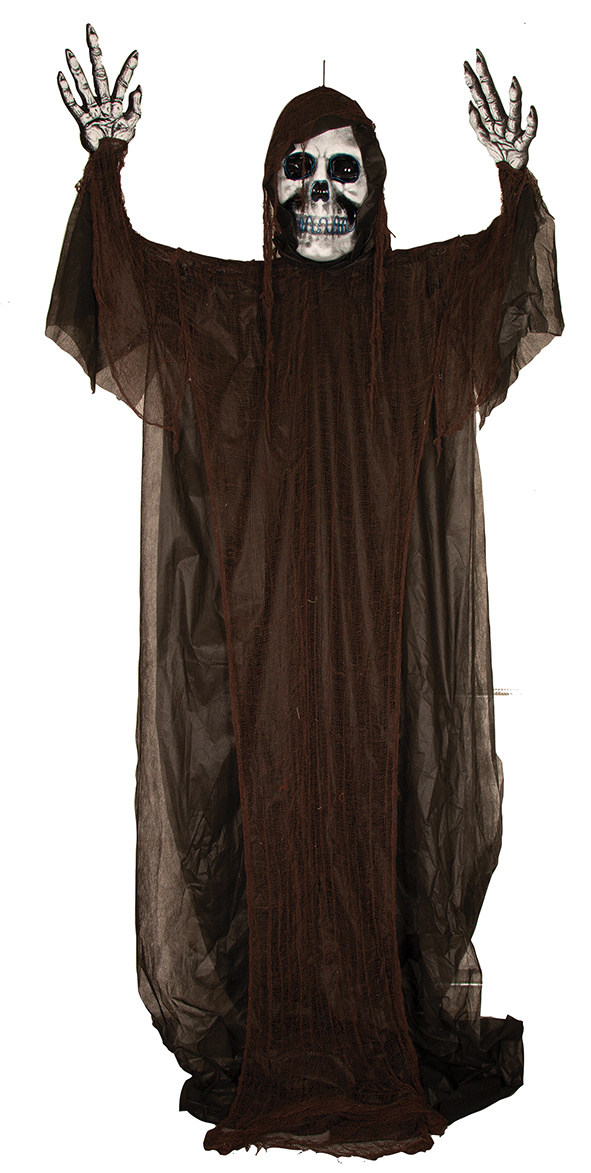 La Faucheuse est habillée d'une couverture noir usée et effrayante. Il a un visage effrayant avec des yeux qui s'allument en rouge.