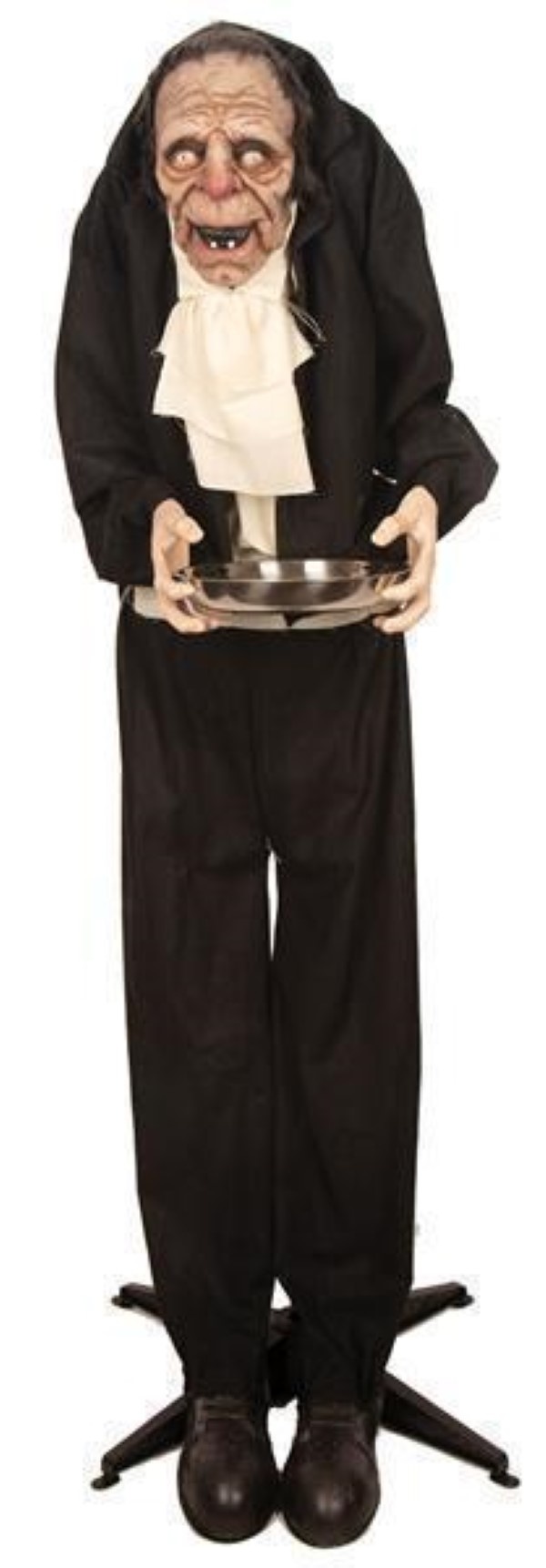 Poupée de décoration d'Halloween sur support, vieux majordome avec bol. il mesure environ 150 cm de haut.