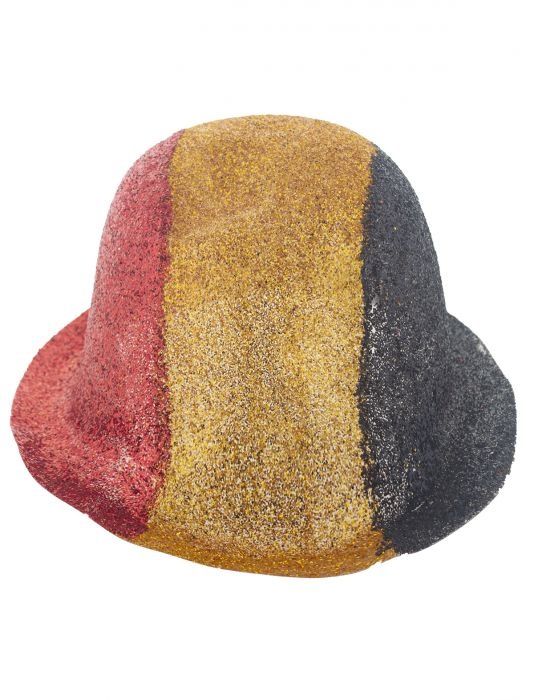 Een glitter bolhoed in de kleuren van België . Het hoedje is gemaakt van plastic en heeft een binnenomtrek van circa 54 centimeter. Weeg niet veel slechts 28 gr.