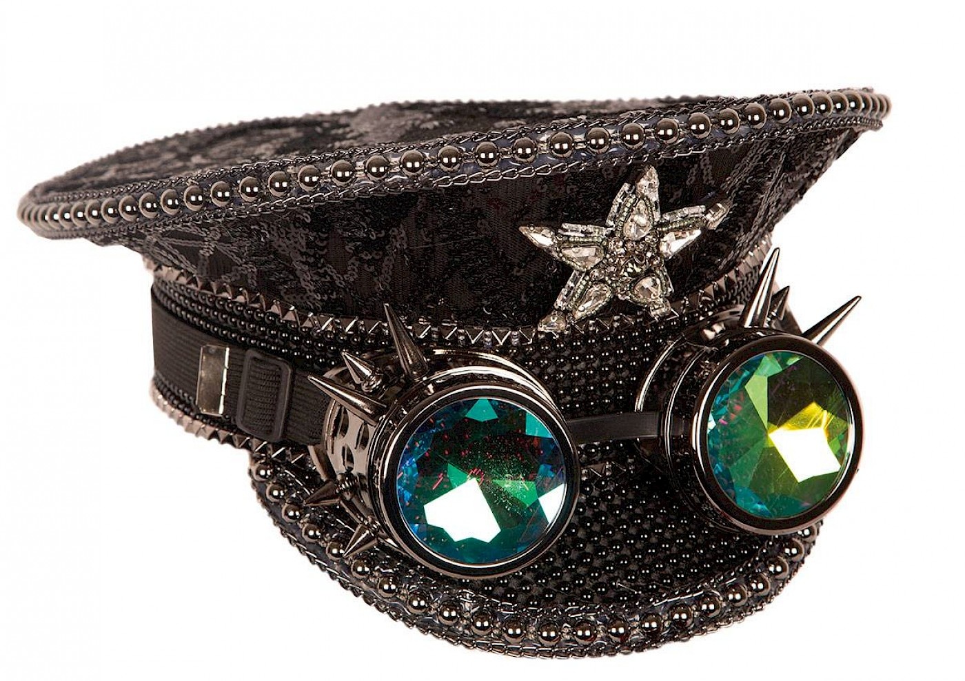 PartylineZwarte luxe kapiteinshoed met steampunk holografische bril | Rave hoed | Concert hoed